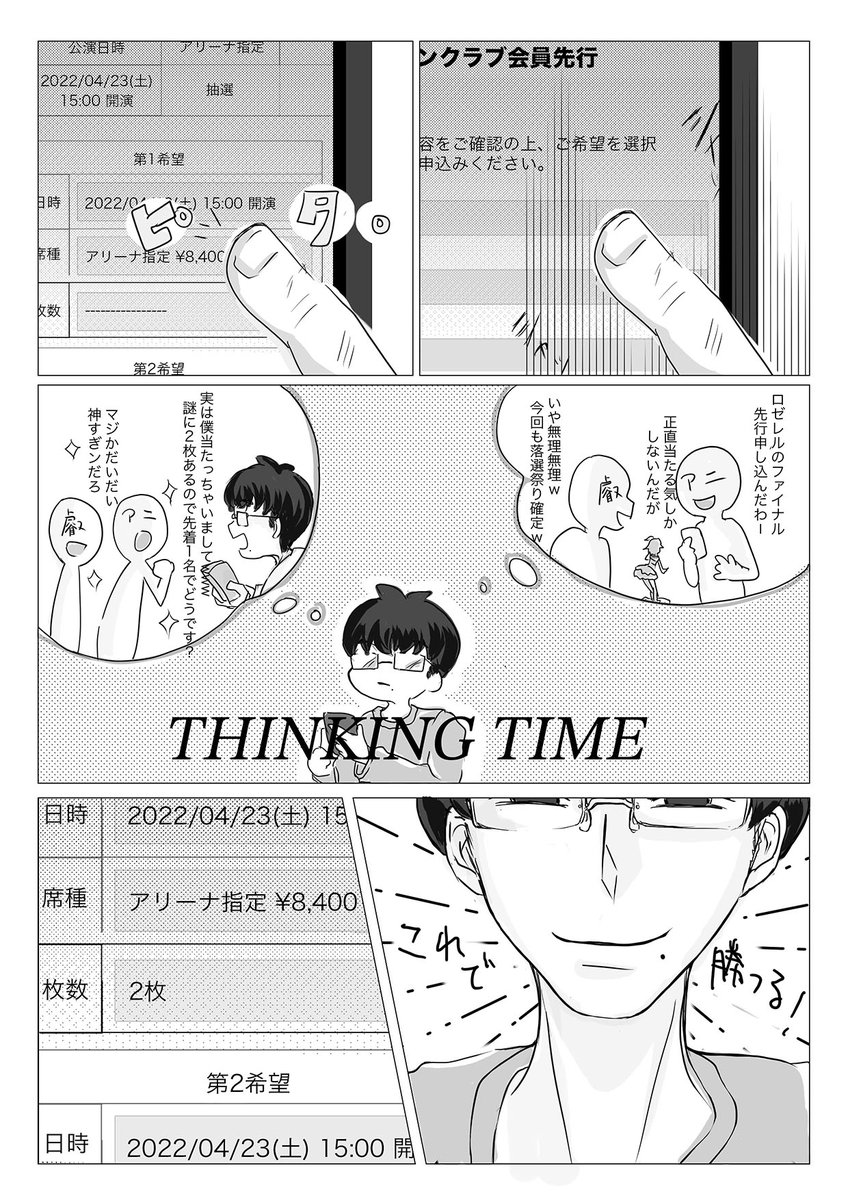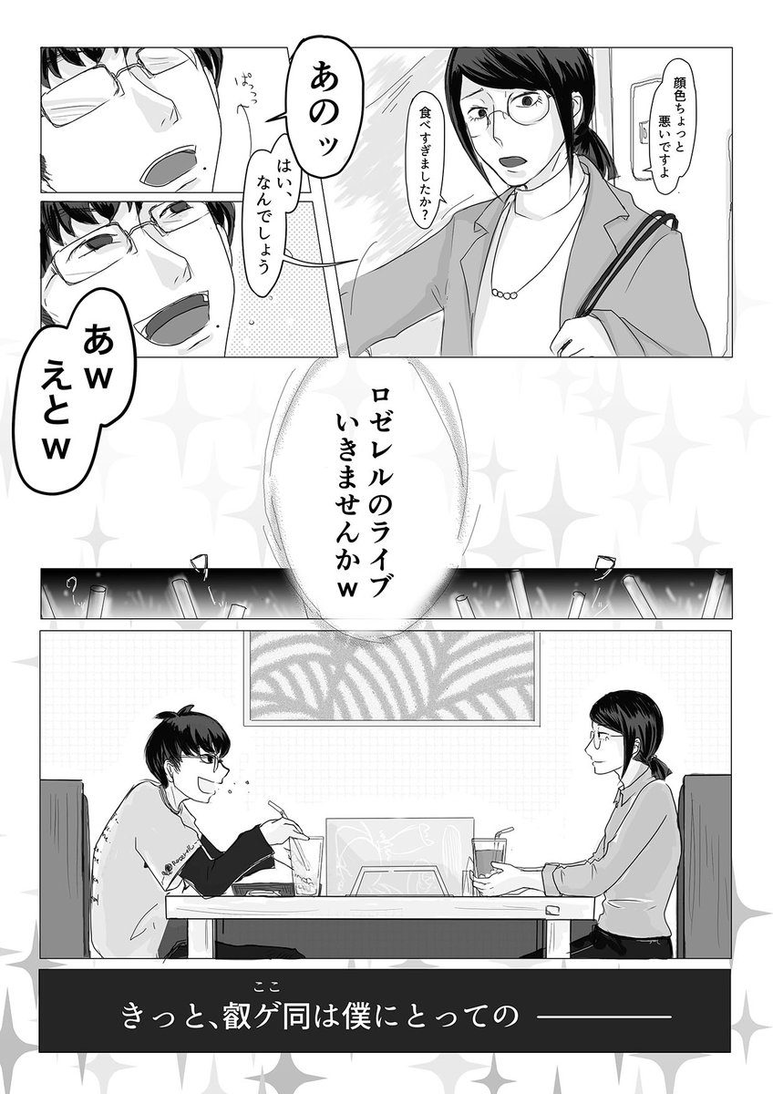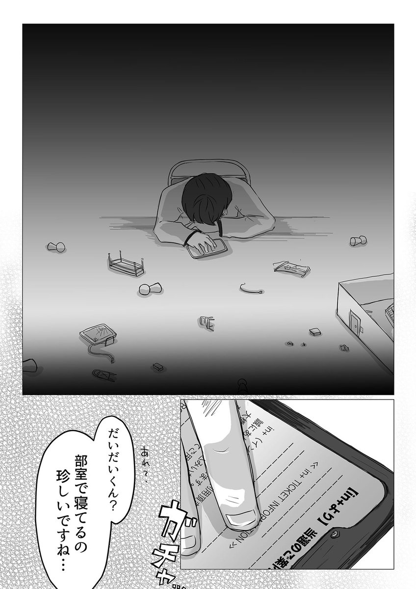 21 116 こちらは叡オンで展示した、だいだいくん&番井さんの漫画です。 「謎に2枚チケットとっちゃったんですけど僕友達いないんで同行者いなくてw」の言葉の意味に気づき、涙したと同時に衝動的に描いたものになります...... #陰ラブFA 23/04/24 22:48