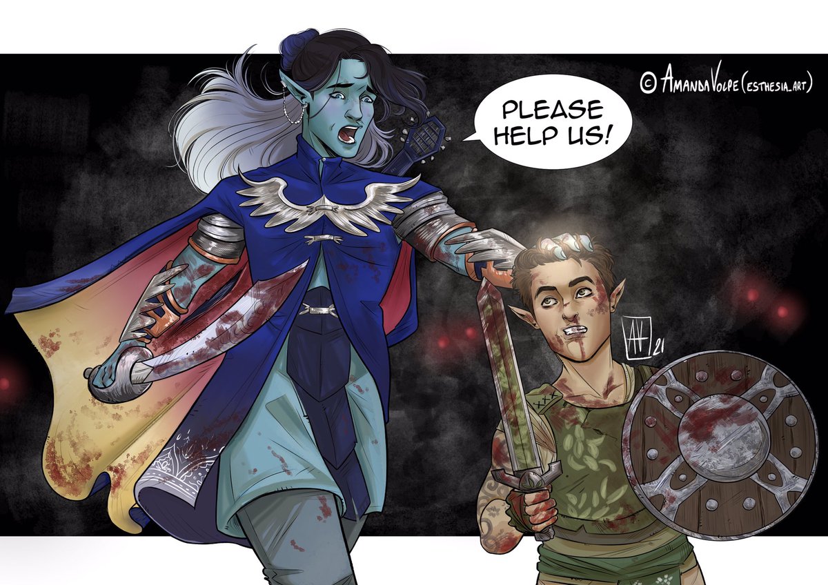 “Please help us!”- Dorian and Orym again, because I love them so much 💕 Thanks to @VoiceOfOBrien and @robbiedaymond for bringing the characters to life! Can’t wait to start Ep 5 and see what will happen! #criticalrolefanart #dorianstorm #orym