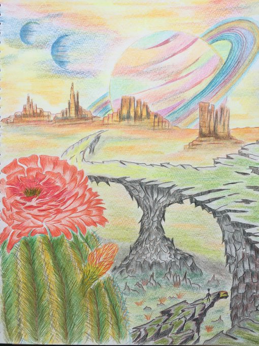 #世界観光の日 #色鉛筆画 #色鉛筆 おはようございます。 サボテンが咲く砂漠。