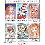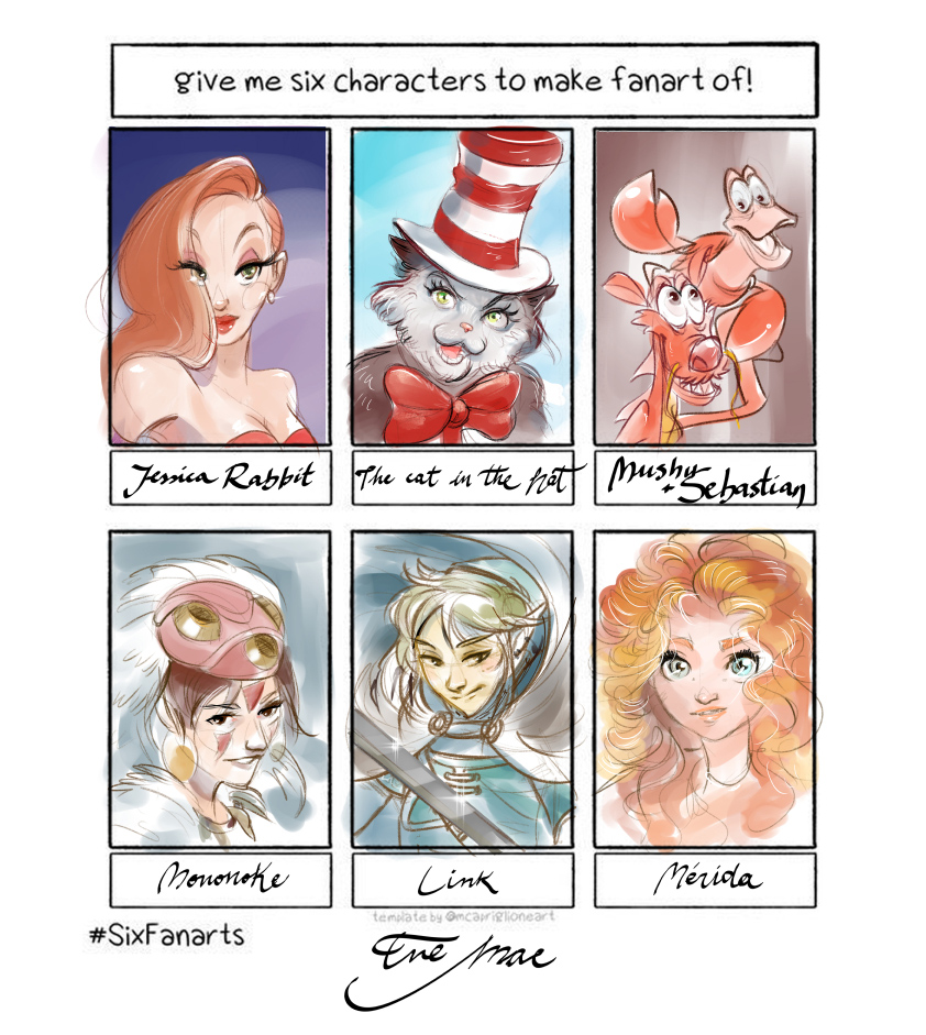 Here I go! Challenge accepted and mission completed. ;) My #SixFanarts Jessica Rabbit The cat in the hat Mushu (Mulan) + Sebastian Princesa Mononoke Link Mérida Hope you like how it turned out!