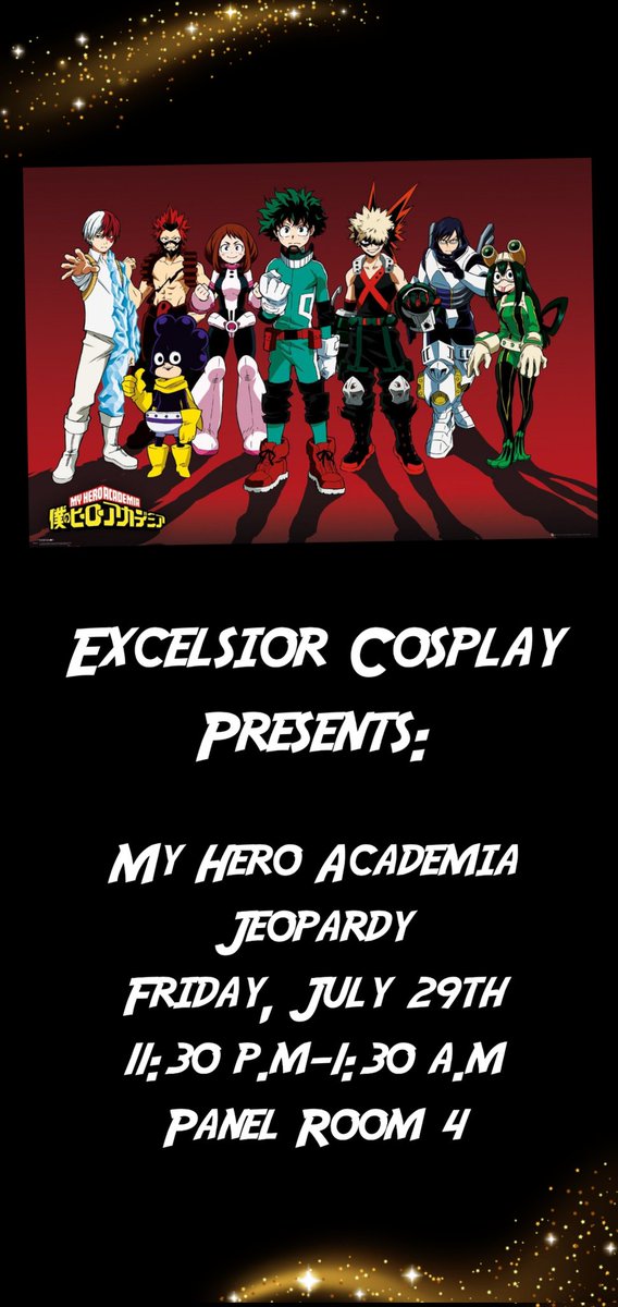Our first panel of the weekend is late Friday! Come test your knowledge at MHA Jeopardy! Winners will receive prizes and audience participation does as well! #cosplay #MyHeroAcademia