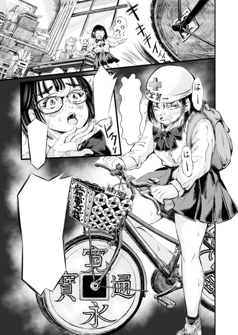 【告知】明日29日正午頃全4ページUPします! 「古銭ガール」GW特別編 先行で1ページ目をサイレントでw デコチャリに乗った主人公、五島せんはなにをしようとしているのか? #漫画が読めるハッシュタグ #漫画 #一次創作 #イラスト #オリジナル #春の創作クラスタフォロー祭り