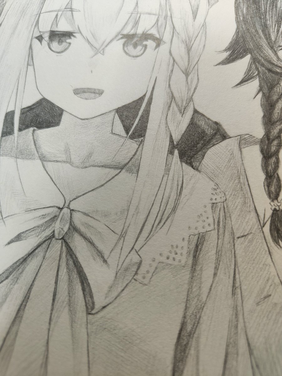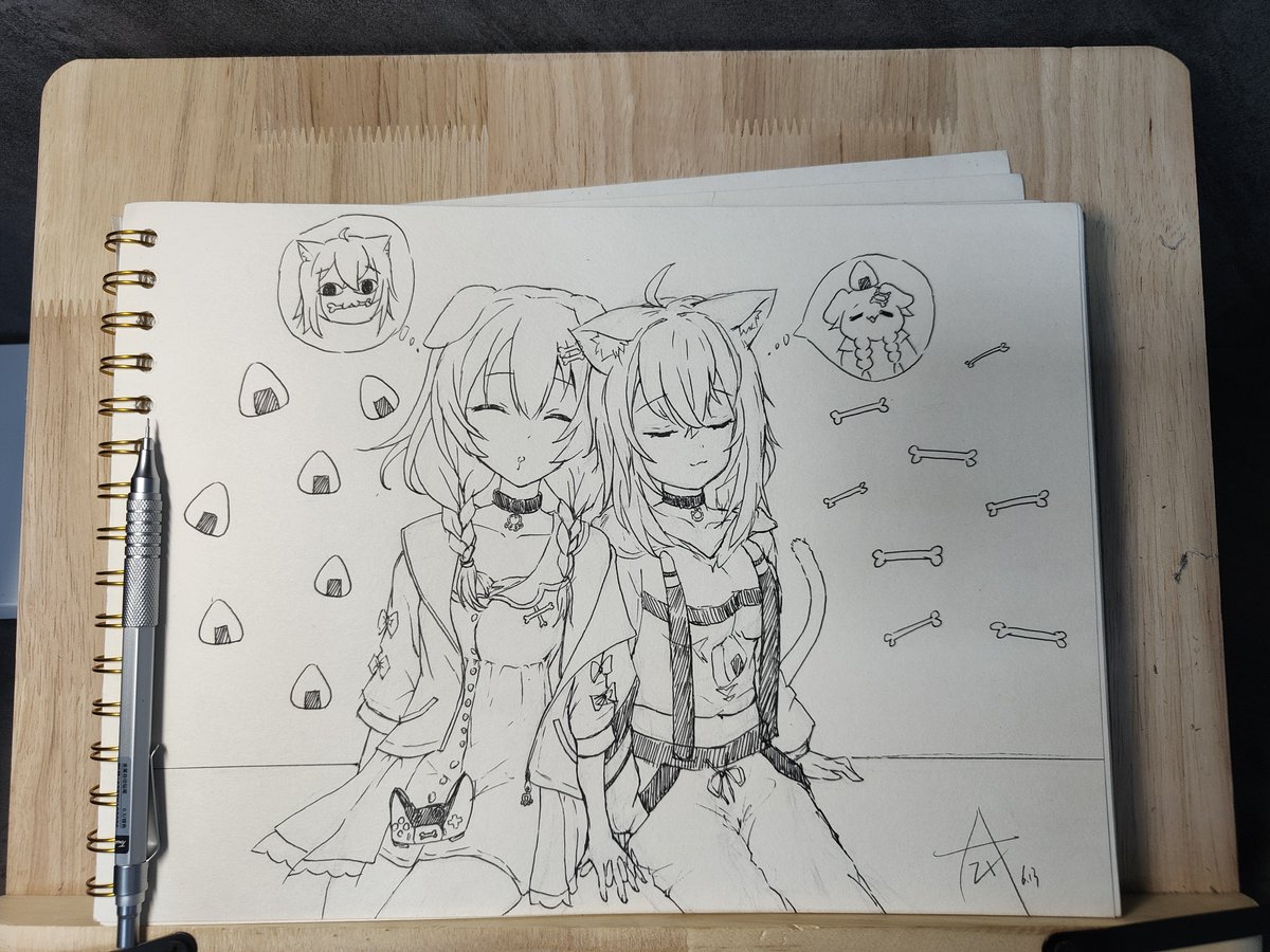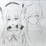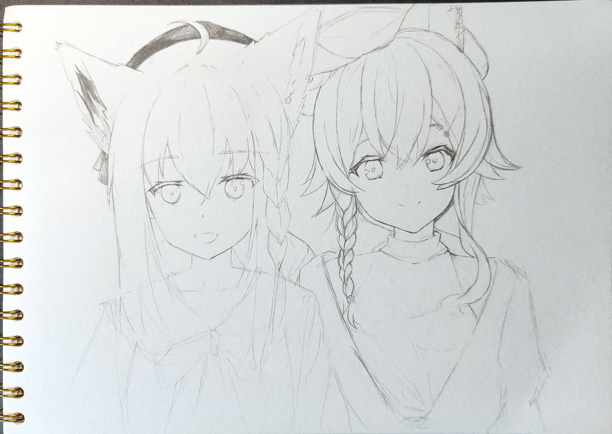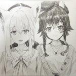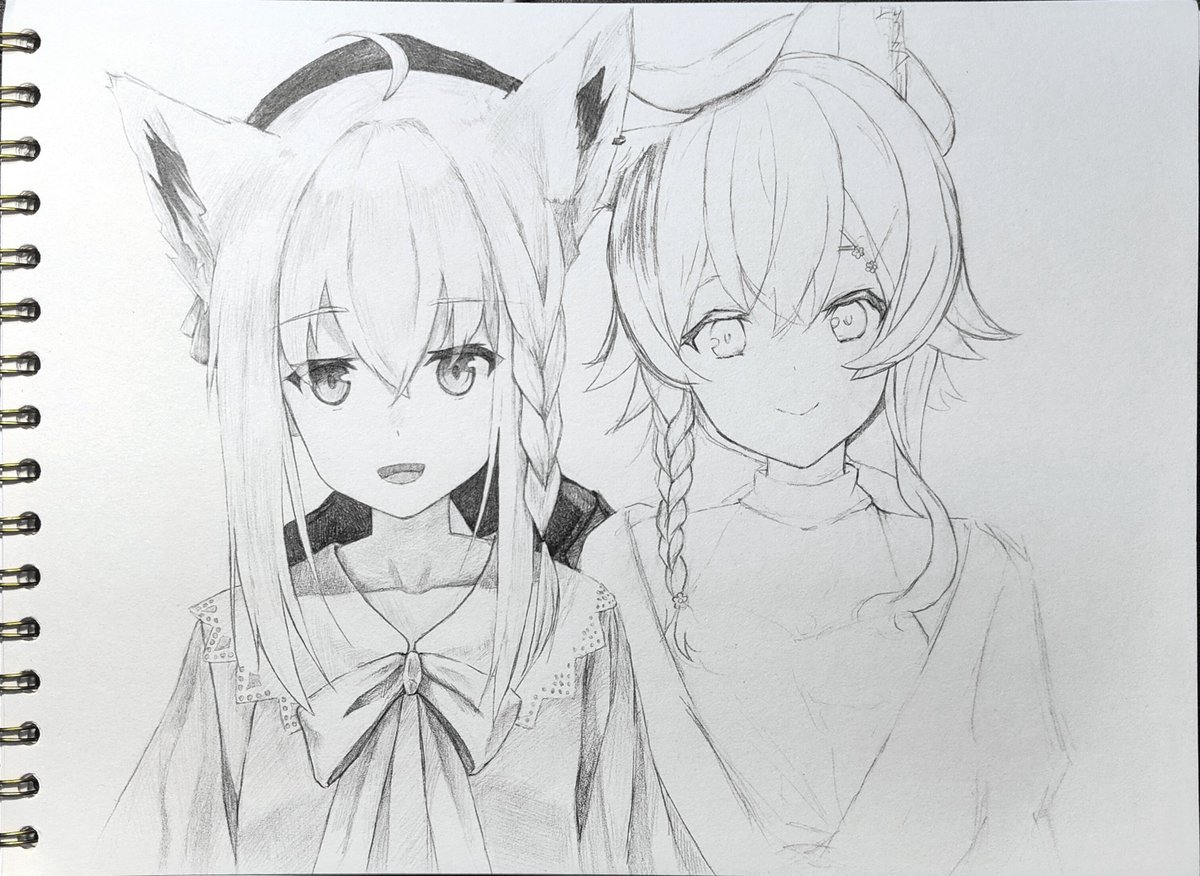 A sketch of Fubuki and Mio @shirakamifubuki @ookamimio #絵フブキ #みおーん絵