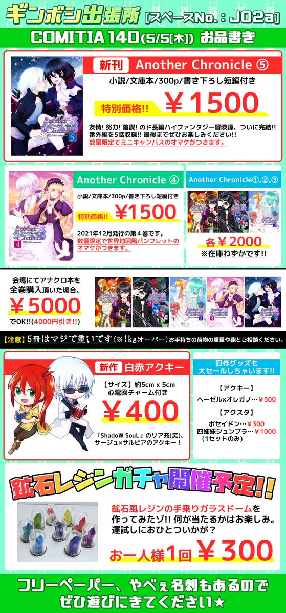 5月5日コミティア144【つ35a】 ギンボシ出張所 ❤お・ま・た・せ❤ お品書きでございます!! 新刊新グッズ共にあります!!やったね!! 既刊も一応数冊持っていきます。 ガチャもやるからぜひ遊びにきてくださ~い🥳🥳 #コミティア144 #COMITIA144 #コミティア144お品書き