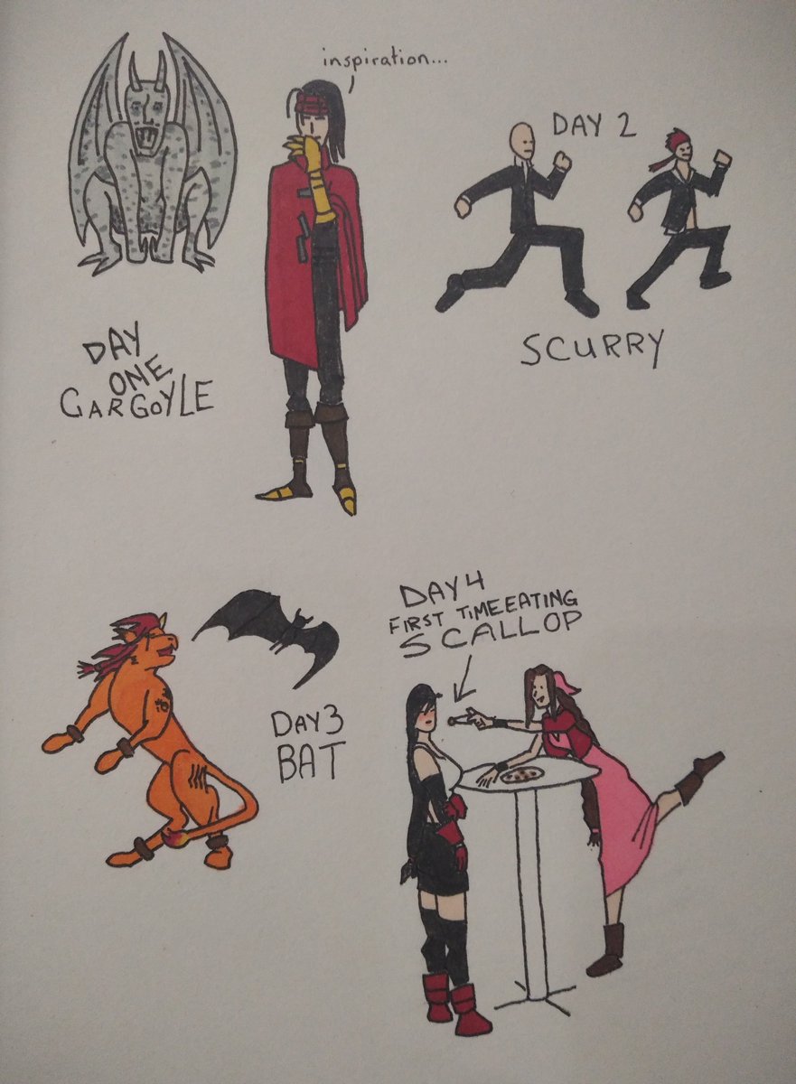 More #inktober prompts from dA. Cloti gets some love here. Poor Johnny. Also, it was pretty challenging and fun drawing our group in Midgar chase vehicles.