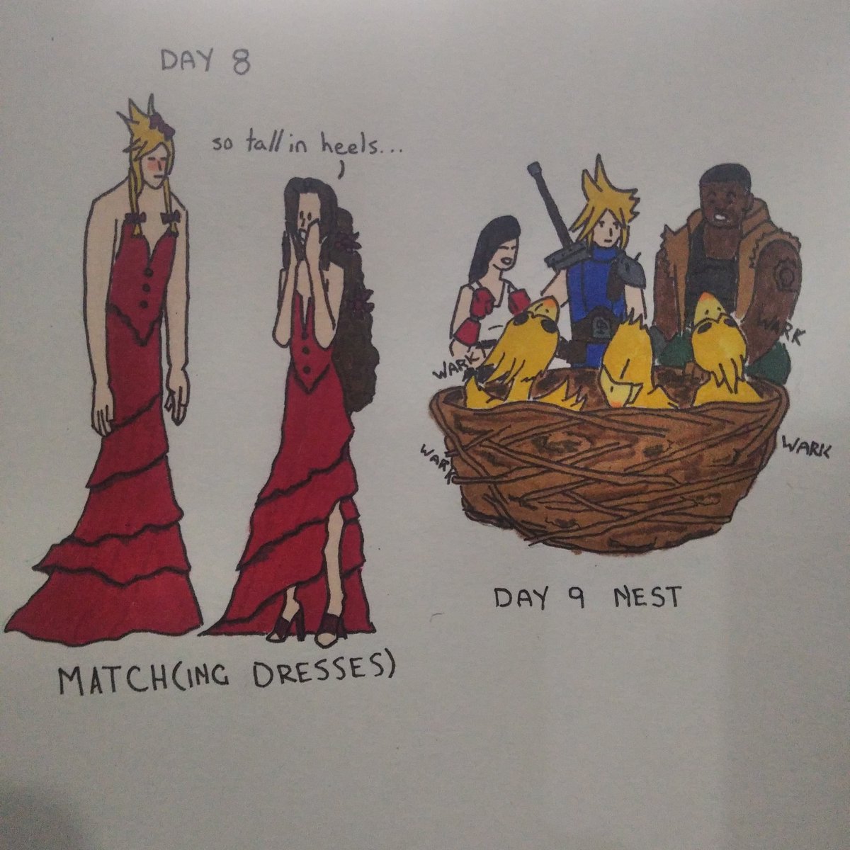 Day 8 and 9 of dA's #inktober2022 Match and Nest prompts. Next up Crabby and Eagle. Shout out to @EtheringtonBros for the tutorial for how to make a nest. Anyway, got Cloud in a dress. And my first time drawing chocobos.