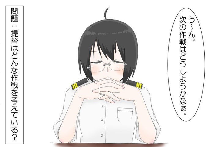 問題です。提督はどんな作戦を考えているでしょう? 1枚目:考える提督ちゃん 2枚目:ジャン・バール(回答者1人目) 3枚目:吹雪(回答者2人目) #艦これ #イラスト
