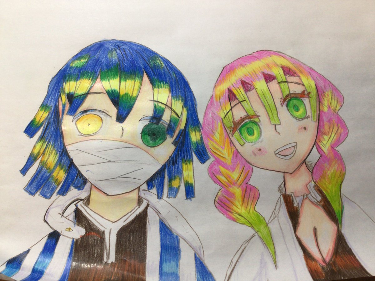 この前描いたおばみつに色をつけてみました🥰 色鉛筆だけで塗りました〜✨ 疲れた…w 相変わらずのクオリティーですが…w #鬼滅の刃 #おばみつ #色鉛筆 #甘露寺蜜璃 #伊黒小芭内