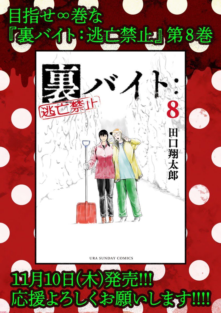 発売日がいつの間に出てましたが、裏バイト:逃亡禁止 第8巻 11/10発売です。何卒よろしくお願いしますッッ!!!