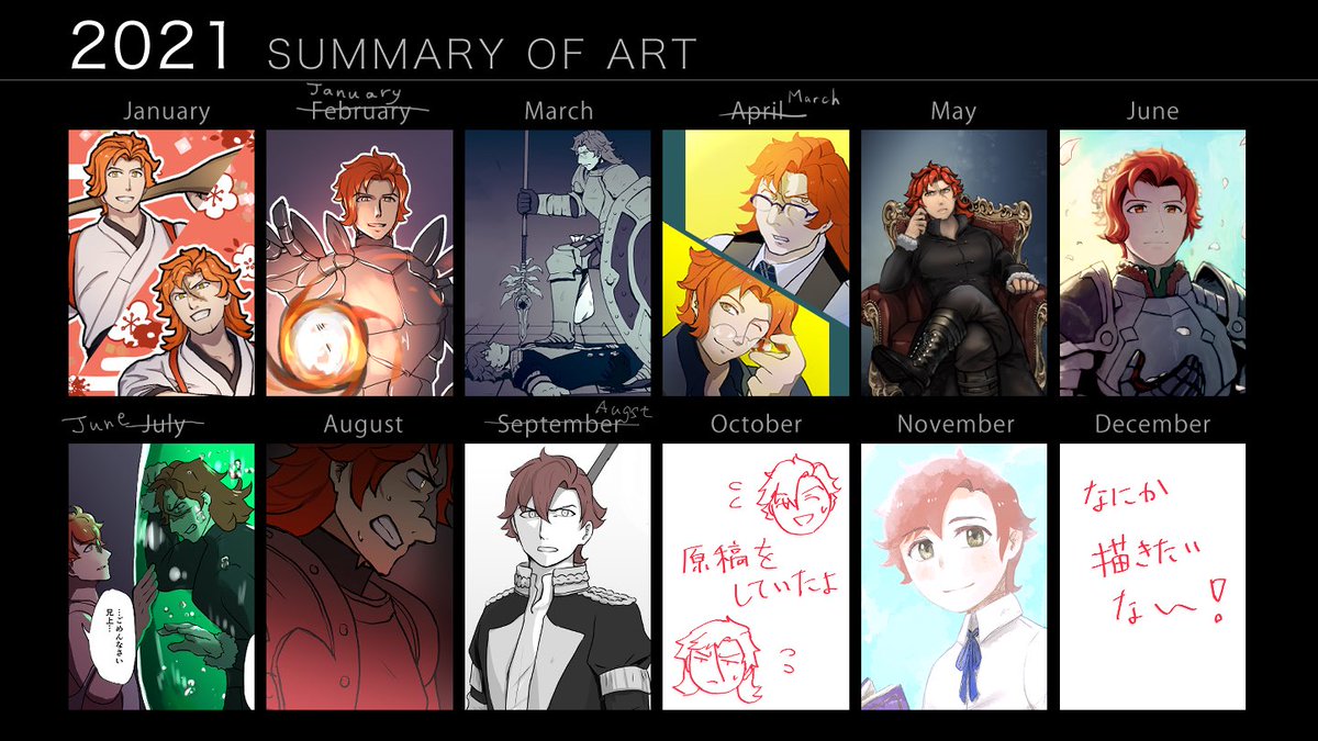 1月 ネップリ企画 2月 ADVANCE+春コミ 6月 シルくん誕生日 8月 兄上の命日 9月 のんかぷ茶会 11月 こくほこ と、本当に楽しかった! まとめは、本にしていないイラスト、漫画からピックアップしてみました!描いてない月は誤魔化してます、すみません… #2021年の絵を振り返る #Artsummary2021