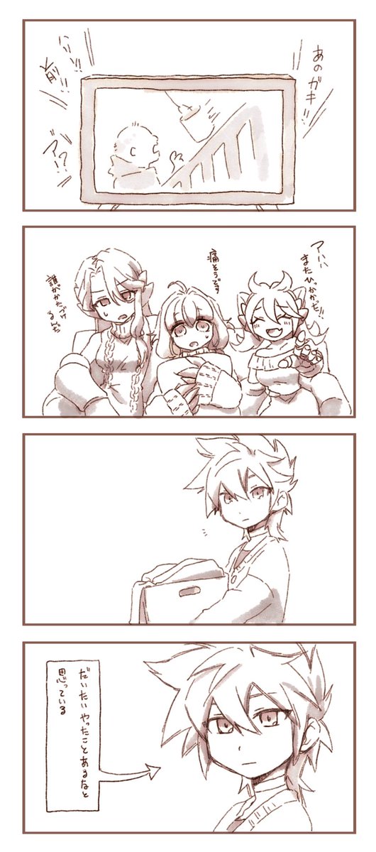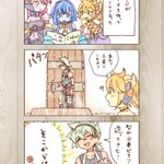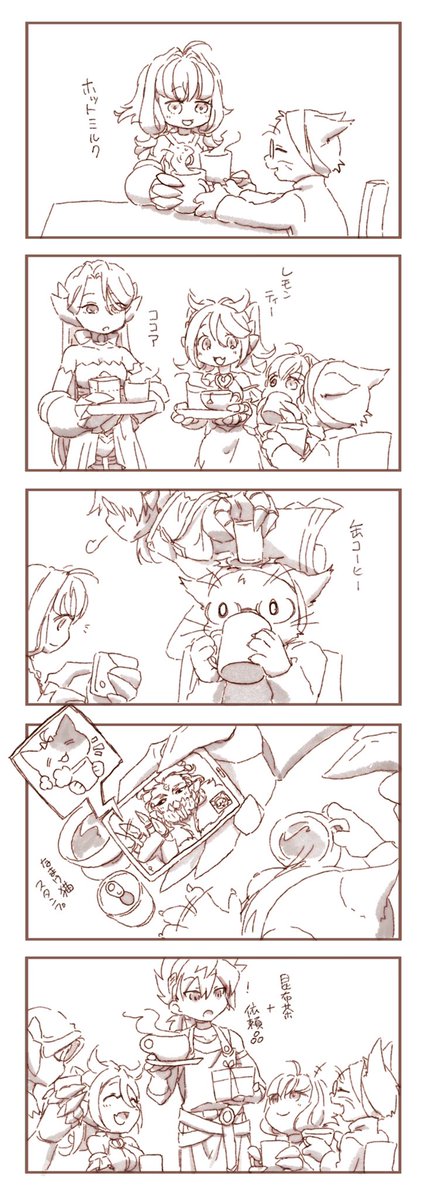 1 10 『モタさんに「おつかれさま」って優しい笑顔で暖かい飲み物を差し入れる魔剣ファミリー』のお題を漫画風で描いてみました。ネーム考えるのが楽しかったです(о´∀`о) ヴェ君のお店の常連てことで。 22/01/04 20:02