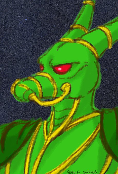 お題【変身・変型】 『SF新世紀レンズマン』より、ドラゴンレンズマン・ウォーゼル。飛行形態への変身(変態?)課程、ちょっと画期的だったと思うんですよね。 がんばって人外を描いてみた(でもバストショット) #懐アニワンドロ #懐アニワンドロ20220618