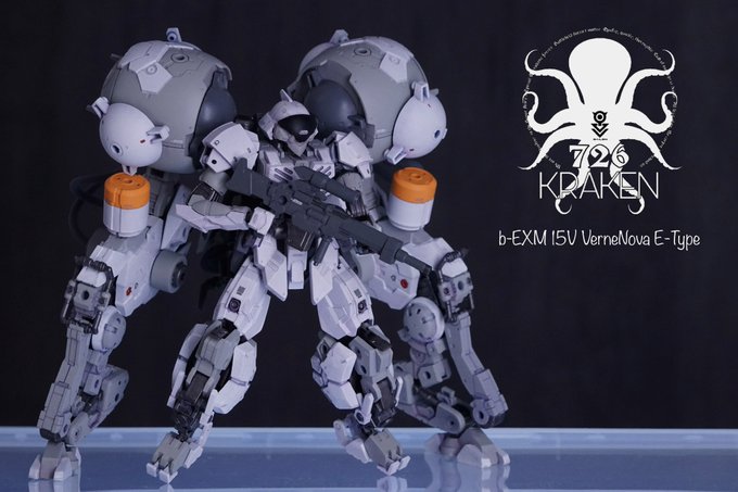 ヴェルヌノヴァE型 特殊部隊クラーケンに配備されている索敵・電子線特化型EXM 機体を支える大型サブレッグには索敵レドームを備え、戦況把握、遺跡のマッピングなど後方支援に徹する また機体に合計4機のロイロイを積載し、攻撃装置の無力化、包囲攻撃をしかけ惑星中心部を目指す #30MM #30MMTAG1204