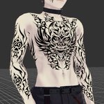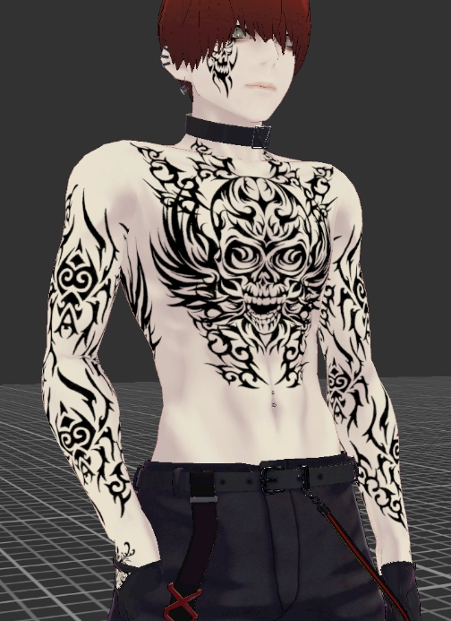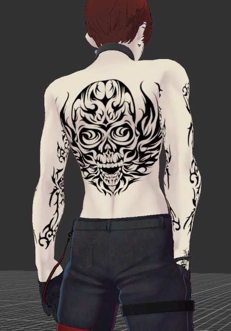 #おつかれまんちんVRC オリジナルのスカルタトゥー清書した💀 とりあえずこれでFIXで。 前はフリー素材のトライバルと組み合わせてるやつで、背中の模様が自分で描いたオリジナル部分。 初めて描いたにしては上出来でそ☺ twitter.com/FU_VRC/status/…