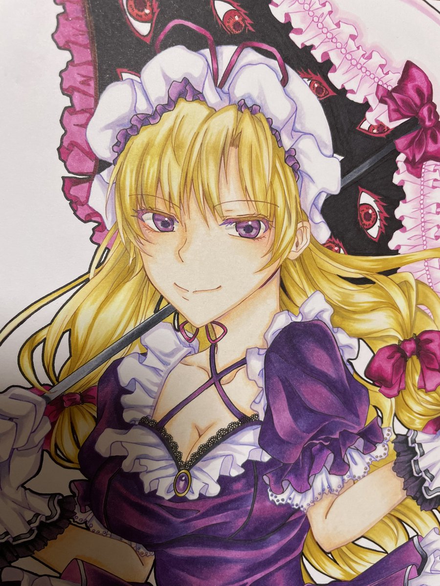 せっかくなので紫様の顔アップ ホワイト入れるのは楽しい 頬はもうちょい紅くしたかった #コピック