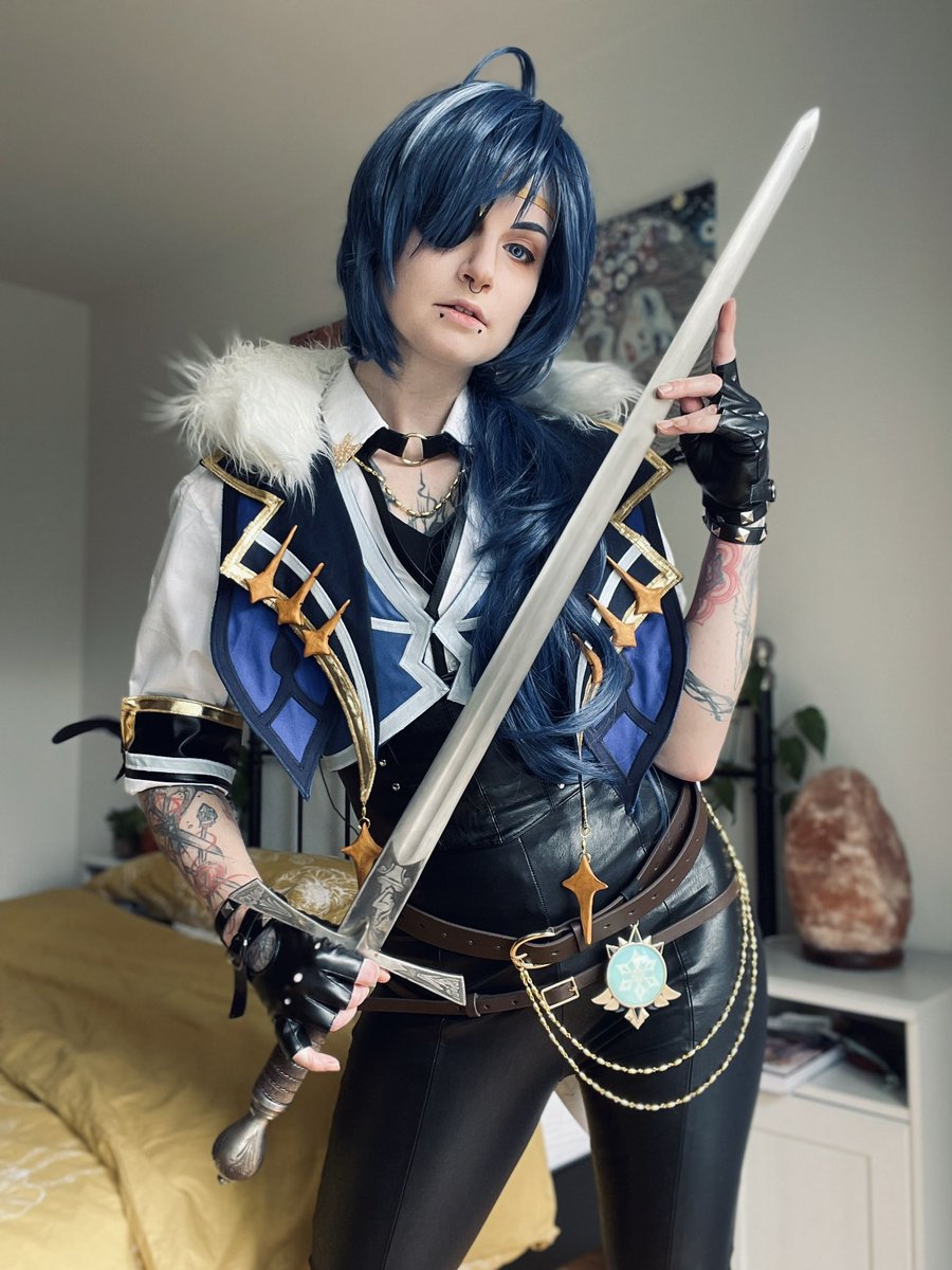 0 1 Put on my Kaeya cosplay I’ve been working on, lately ❄️ it looks alright ✨ #kaeyaalberich #cosplay 23/04/05 15:32