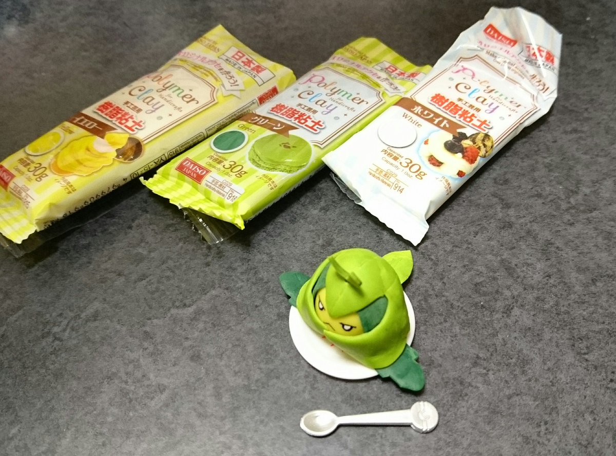 27 38 #ダイソー樹脂粘土 でクルマユちゃんを作りました。絵の具使わなくても粘土同士で調色できるのが手軽でいいですね〜。かわいくできました!クルマユちゃんのいる日常…(*´ω`*) #造って遊ぼ #樹脂粘土 #クルマユ 17/03/23 12:58