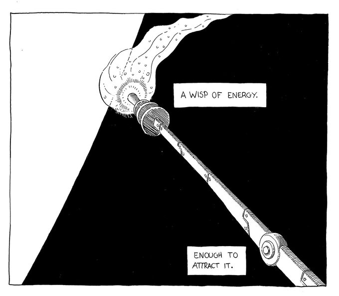 2- WISP 2nd image done, and there is still day light. What will be attracted by the energy generated by this rod ? Don't miss tomorrow's post, or, if you can't wait that long, just watch my stream tonight on Twitch. #falcato #inktober #inktober2020 #wisp #penandink #scifi #comics