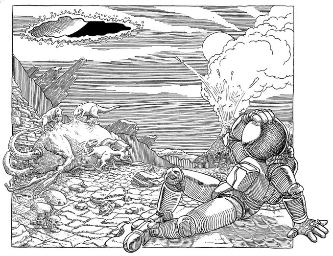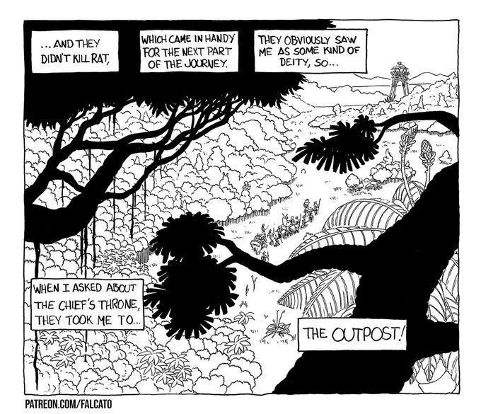 And Again. Day 15- #OUTPOST Where are they going? Is Yuri a god ? I'm doing all #inktober2020 live, two sessions every day (almost :). (links in bio) #falcato #inktober #penandink #jungle #comics #scifi #journey #sciencefiction #illustration #prehistoric #chieftain #handdrawn