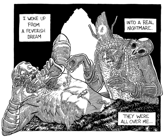 Slowly catching up. Here's 12- #SLIPPERY Recovering from a bug bite, helped by a shaman. Yuri doesn't like #leeches I'm doing all #inktober2020 live, daily. (links in bio) #falcato #inktober #penandink #leech #comics #scifi #sciencefiction #illustration #prehistoric #shaman