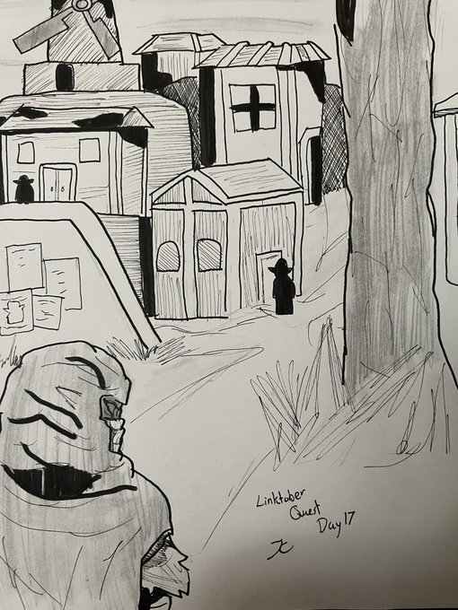 Linktober Quest Day 17. Some form of humanity makes the merc return to Kakariko Village. #linktober #linktober2022 #linktoberquest #linktoberquest2022 #inktober #zelda #legendofzelda #nintendo #art #artwork #drawing