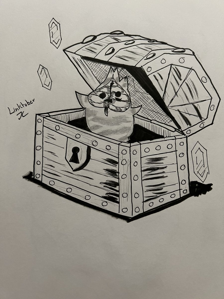 Linktober Day 26: Treasure. A big chest holding some rupees…wait how did you get in there!! #linktober #linktober2022 #inktober #zelda #legendofzelda #nintendo #art #artwork #drawing