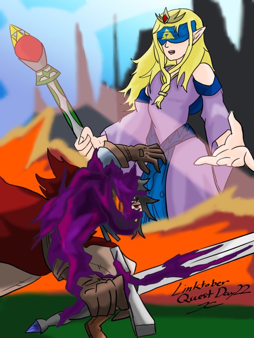Linktober Quest Day 22. The flames of the monster's rage and the divine magic of the princess will clash in Kakariko Village. #linktober #linktober2022 #linktoberquest #linktoberquest2022 #inktober #zelda #legendofzelda #nintendo #art #artwork #drawing