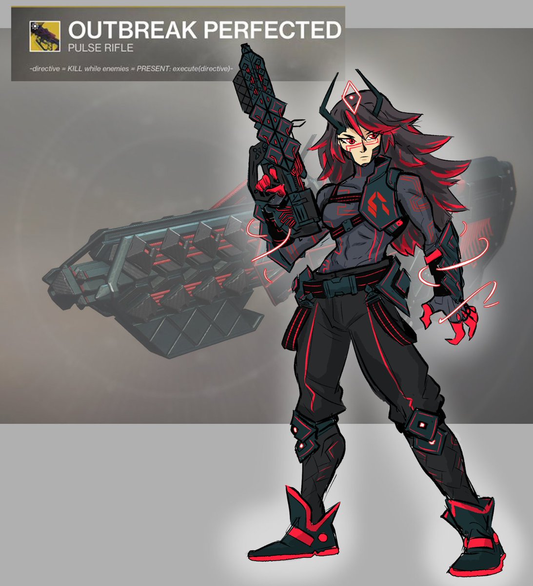 A couple more #D2GunGirls. Ace of Spades and Outbreak Perfected. Ace is probably my favorite gun in the game so I let myself be a little self-indulgent with the design. #Destiny2 #Destiny2Art