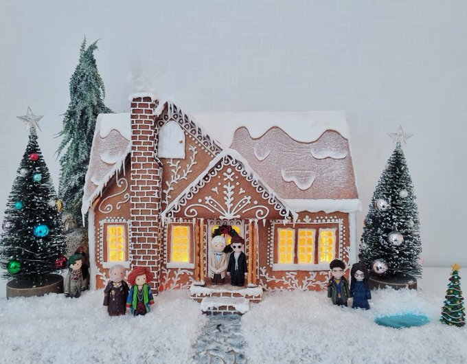 I made a gingerbread cottage for my clay figurines 🙂 My first gingerbread house ever, so I'm quite proud of it ☺️ #GoodOmens #IneffableHusbands #GoodOmensFanart #Aziraphale #Crowley #GingerbreadHouse @neilhimself @michaelsheen