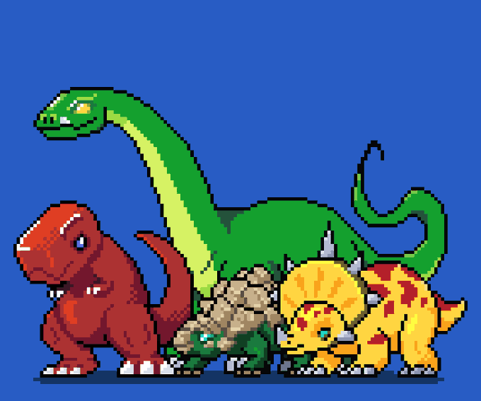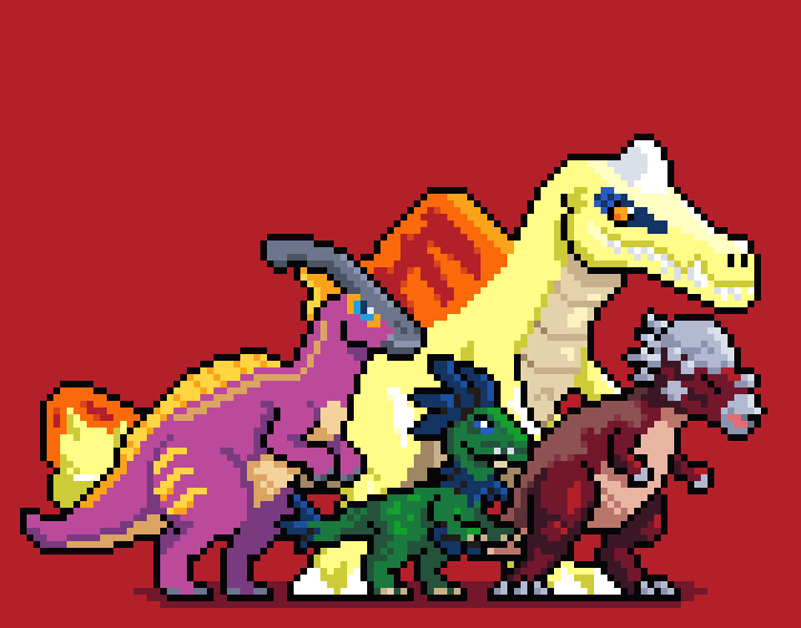 Rawr Nice peple from twitter here are more DINOS, this pack includes, the amphibious monster SPINO, hard head dino, a Parasaur and Raptor (maybe utah) #pixelart #paleoart #dinosaurs