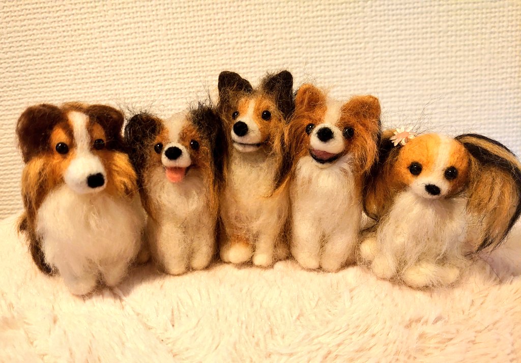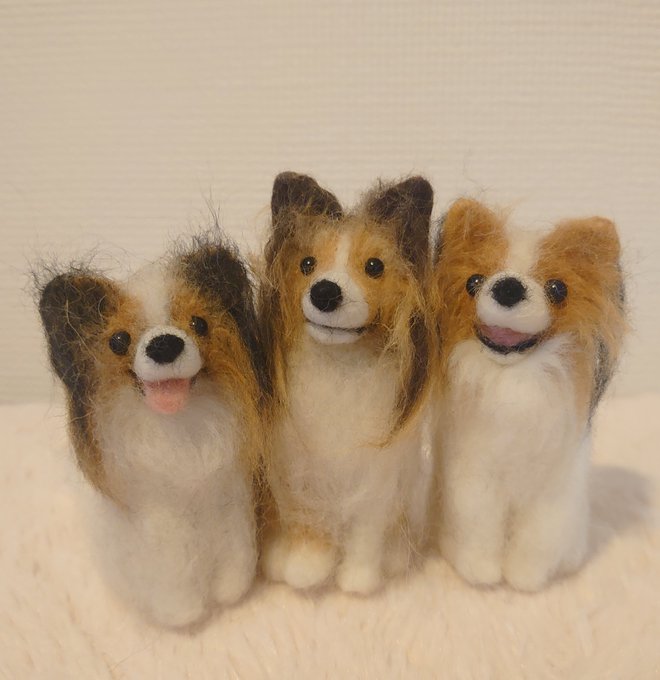 3 170 skpk @Zaurus86 様に作って頂いた空良、咲良、カイル君です😆🎵🎵 もう、と~っても可愛いです❤️ 3枚目は、私が作ったのと一緒に並べてみました❗ とても嬉しいな🎵 ありがとうございました😊 #羊毛フェルト #パピヨン #シェルティ 20/06/09 18:54