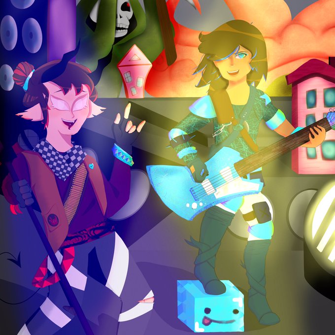 Calm in the Day, Full of Fiery at Night | Happy Duo, but they’re Rock Stars | | | This is inspired from a game I played in my childhood, guitar hero 2! I loved the aesthetic of the game, so here we are :] @BadBoyHalo @skeppyextratoo #happytwt #badboyhalofanart #SkeppyFanArt