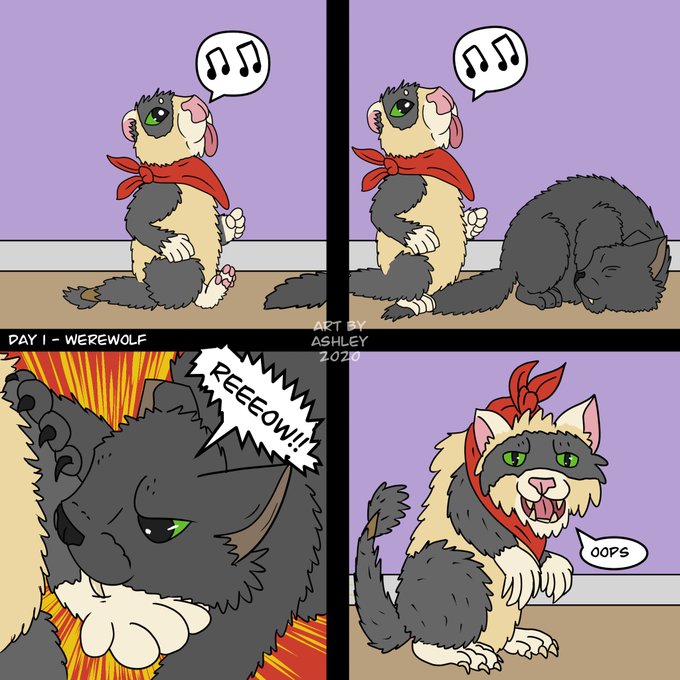 #Comictober Day 1 - Werewolf~ Will hopefully be releasing a daily comic until Halloween. Heres the first day for you all. :) #comictober2020 #ferrets #ferret #werewolf #halloween #inktober2020 #inktober #comic #webcomic #originalcharacters #mustelid #mustelidae #cats #blackcat