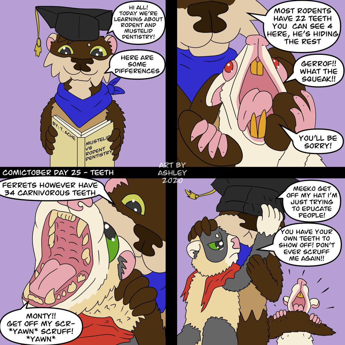 Comictober day 25 - Teeth Monty explores the differences between rodent and mustelid teeth. ;) #comictober #comictober2020 #inktober #ferret #ferretgram #instaferret #rat #rats #albinorats #webcomic #comic #funnycomic #dentist #dentistry #animalteeth #mustelids #rodents