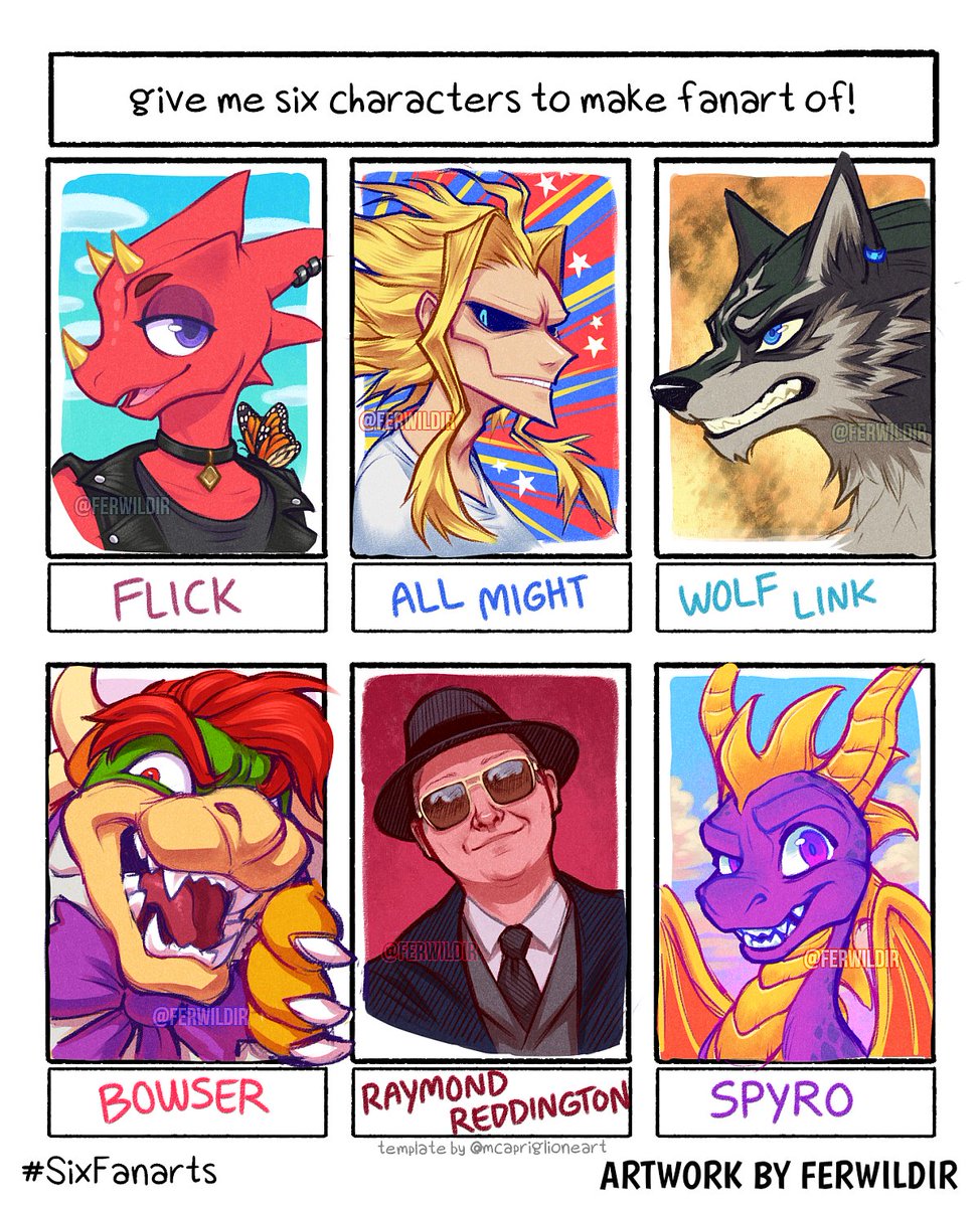 This took me forever but I DID THE THING These are my #SixFanarts!!! Enjoy! 💜 Template by @mcapriglioneart! #SixFanartsChallenge #Spyro #RaymondReddington #ACNH #Bowser #AllMight #WolfLink