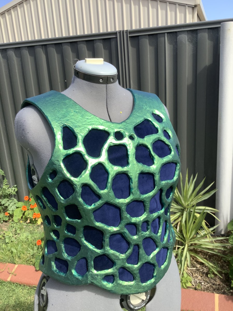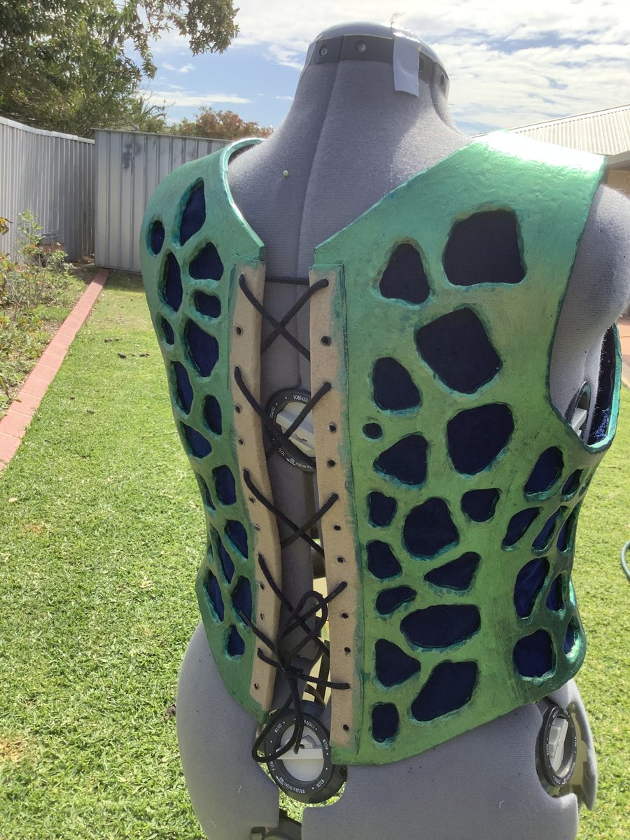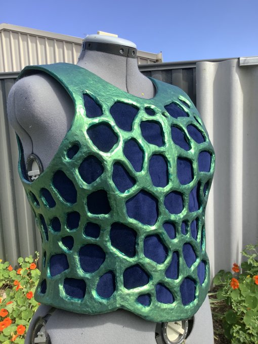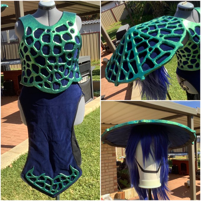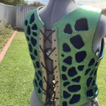 Progress so far on my sorta-samurai tortoise beetle inspired set. It was bugging me that it was sitting on the mannequin half finished, So I’ve done a bit more. Bracers, shin guards, and a weapon and I’ll call it done! #cosplay #originaldesign #tortoisebeetle #samurai