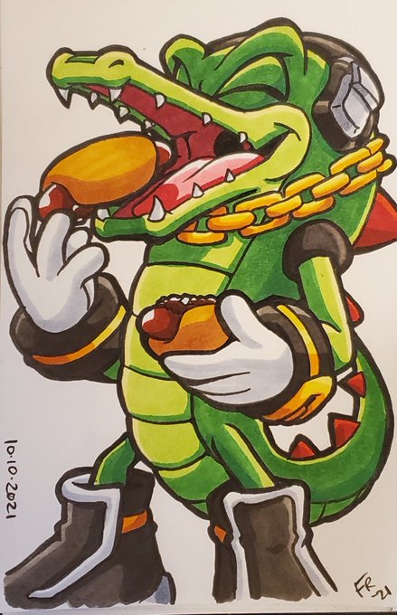 #ChiliDogtober Day 10 with Vector the Crocodile! Worked on this during my art stream on #Twitch this evening! Next time swing by to check it out and hang out! Link can be found on my profile! #inktober #inktober2021 #inktober2021day10 #fanart #sonicfanart #vectorthecrocodile