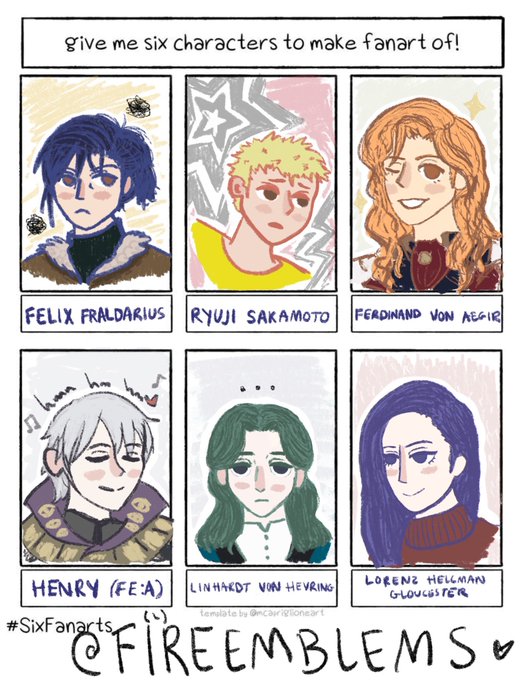 here's my take on the #SixFanarts challenge!! ty for the character suggestions, i learned a lot and had so much fun doing this 🥺 say hello to felix, ryuji (p5), ferdinand von aegir, henry , linhardt, and lorenz (mostly fire emblem lol) ❤️