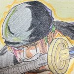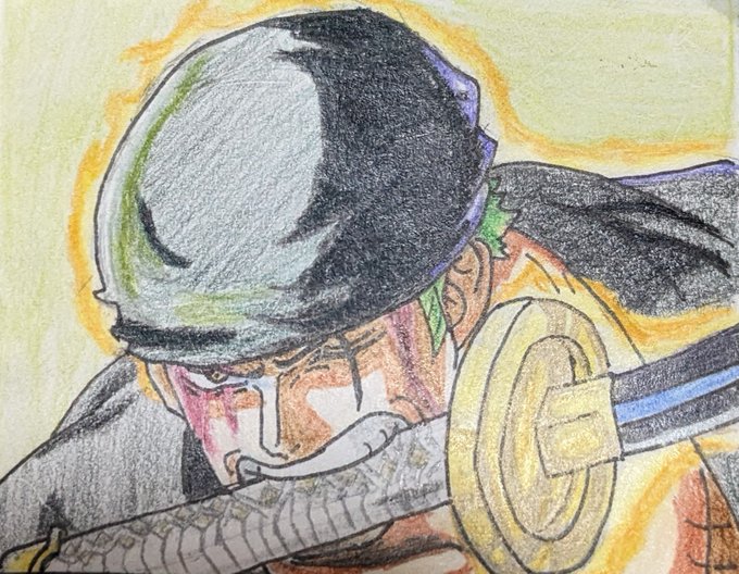 3 12 刀クッソ雑やけど、背景もゾロっぽい緑で塗って完成!! 紙のサイズ6センチはちっちぇw #イラスト #模写 #色鉛筆 #ワンピース #ゾロ 23/04/17 23:33