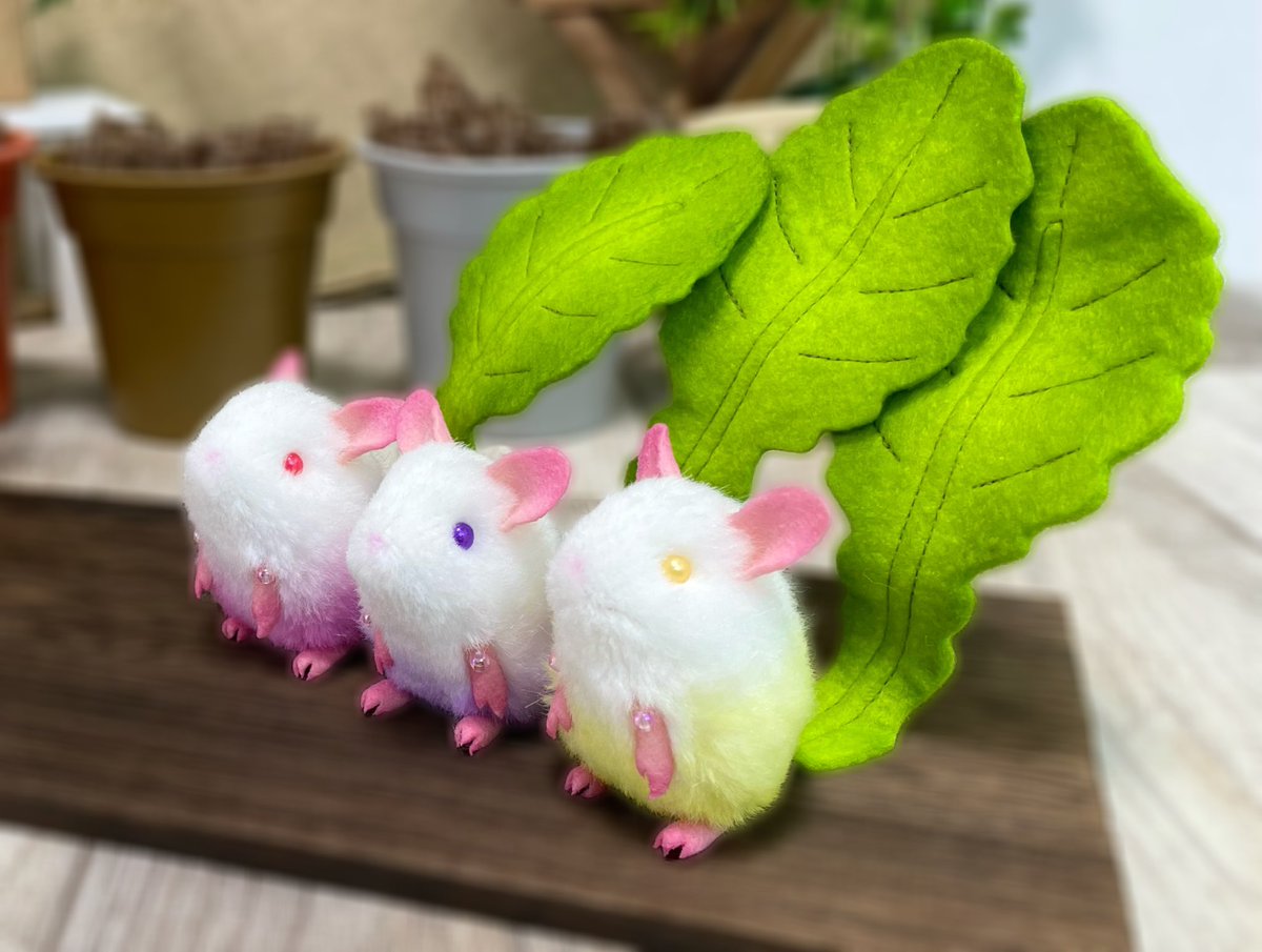 #デザフェス55 に連れて行くラディラット達が完成しました!🐁🥬 今回は新色の「パープル」「ホワイト」も加わって一層賑やかに✨ 並べるととってもカラフルですが、実は実際のラディッシュにもある色なんですよ! 飼育セット付き¥10,000- 11、13、15時に分けて3〜4匹ずつ販売します! #Fluff_mate