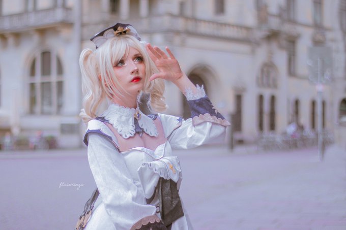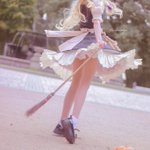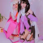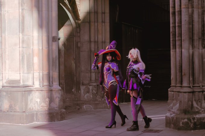 On our way to meet up with our dear traveler 😌 - Mona: linn.tooruu 💜 (Insta) 📸🖌️+fischl: me - [#mona #fischl #genshinimpact #genshinimpactcosplay #コスプレ #アニメ #原神]