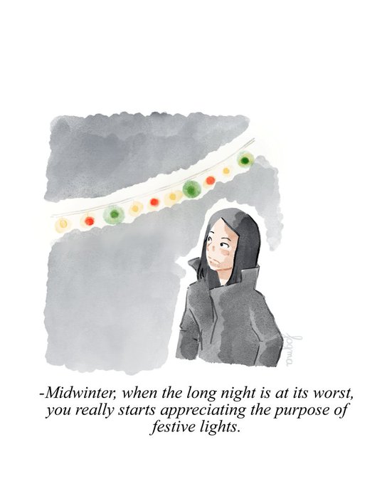 Now, we're on the other side! The days are finally getting longer! How are the Christmas lights in your nieghbourhood? Are you looking forward to the big party tomorrow evening? #christmas #solstice #lights #festive #holidays #cartoon #illustration #night