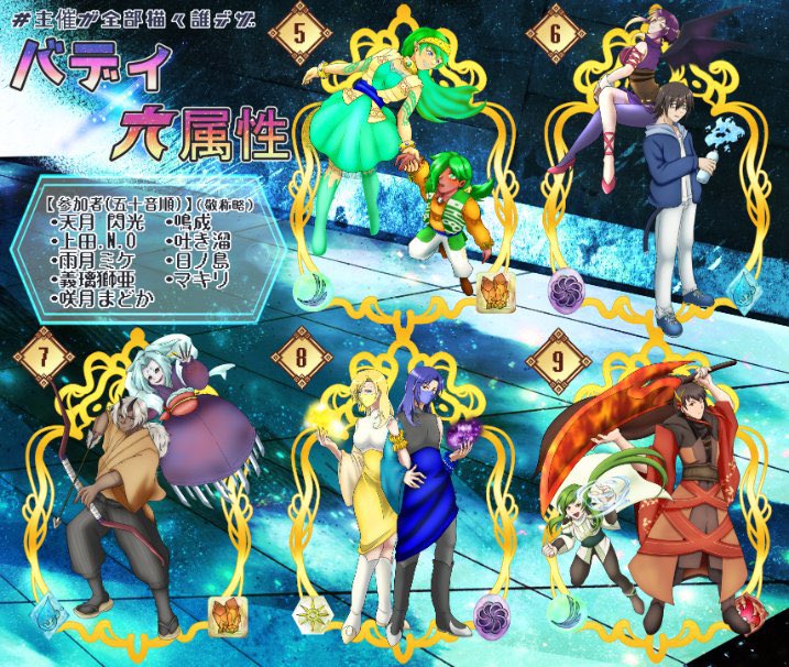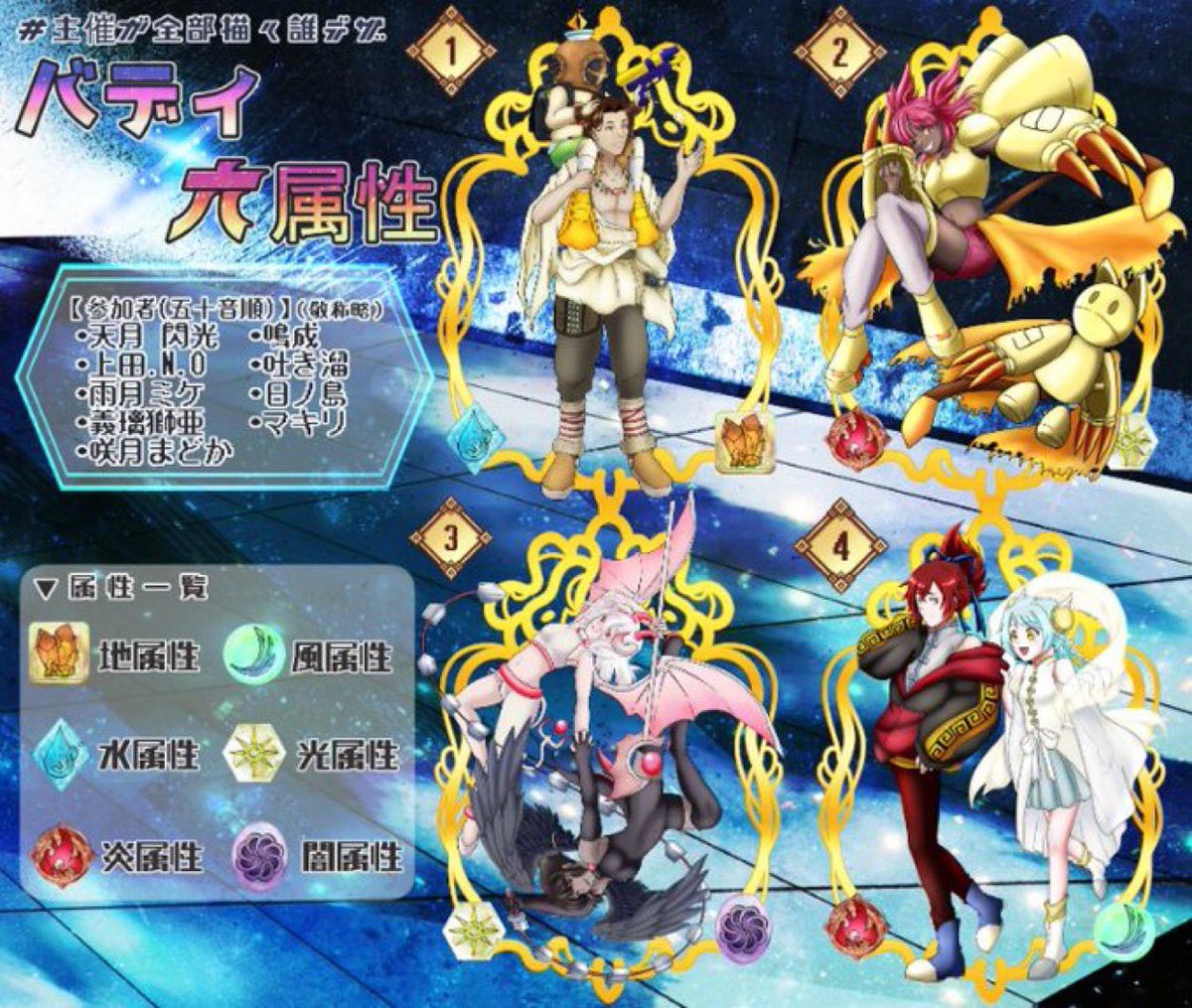 天月 閃光さんの #主催者が全部描く誰デザ に参加させていただきます✌️ 今回は「バディ×六元素」!私の描いたキャラデザはどれだと思いますか? ツリーにアンケート載っけますのでよろしくお願いします✨🙏✨