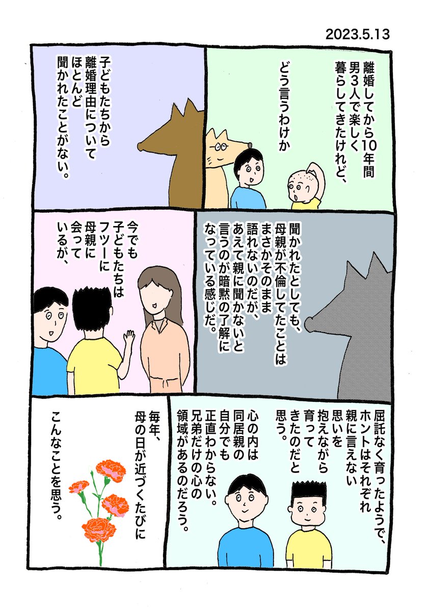 51 1009 はっきり説明しろと思うかもしれないけど、実際はなかなかそうはいかないのですよ。勘の良い子どもたちなので薄々事情はわかってると思うけど。 へんな気を使わせてしまったことは申し訳なく感じている。 23/05/13 20:03