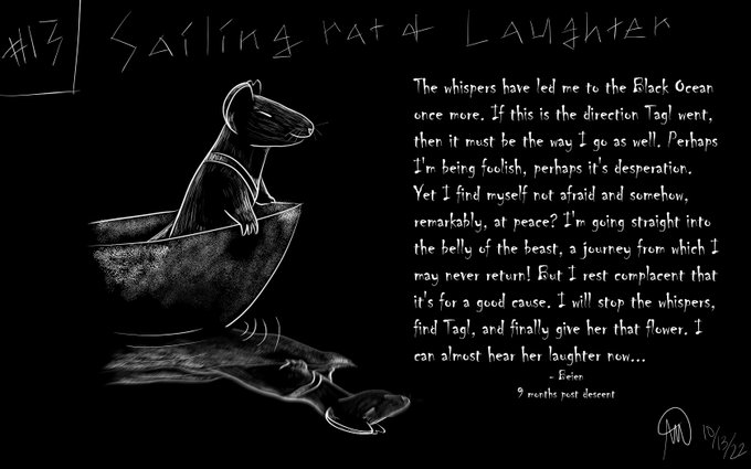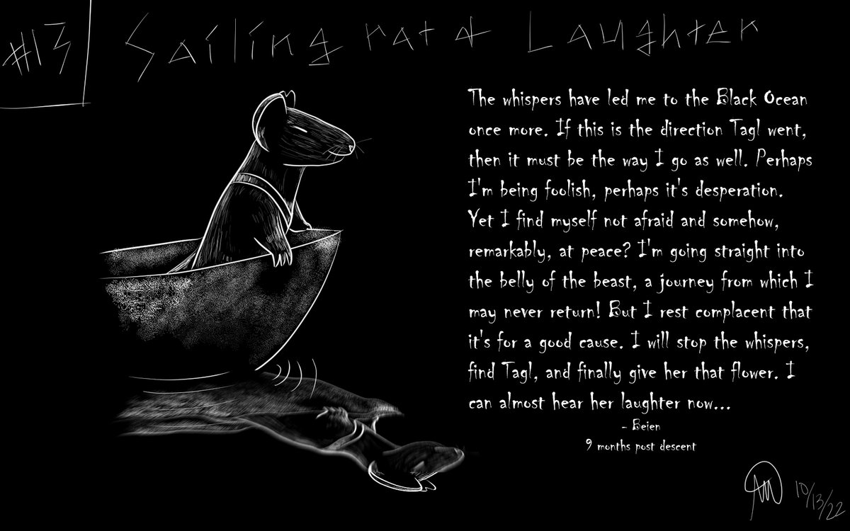Blackout Day 13 - "Sailing Rat" and "Laughter" The Black Ocean is a strange expanse of remarkably still water found in the deepest caves of Leilan. Supposedly it's the edge of the world... #inktober2022 #rattober #rattober2022 #beansrattober #darktober #inktober #InkToberDay13