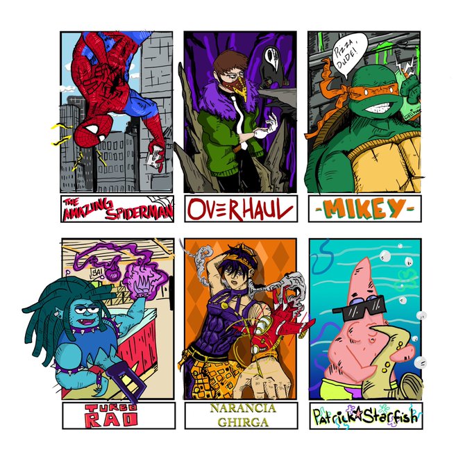 #SixFanarts challenge . #Spiderman #overhaul from #MyHeroAcademia , #Michelangelo , #TurboRad from #okkoletsbeheroes @ianjq , #Narancia from #jojosbizarreadventure and #Patrick from @SpongeBob #SpongeBob