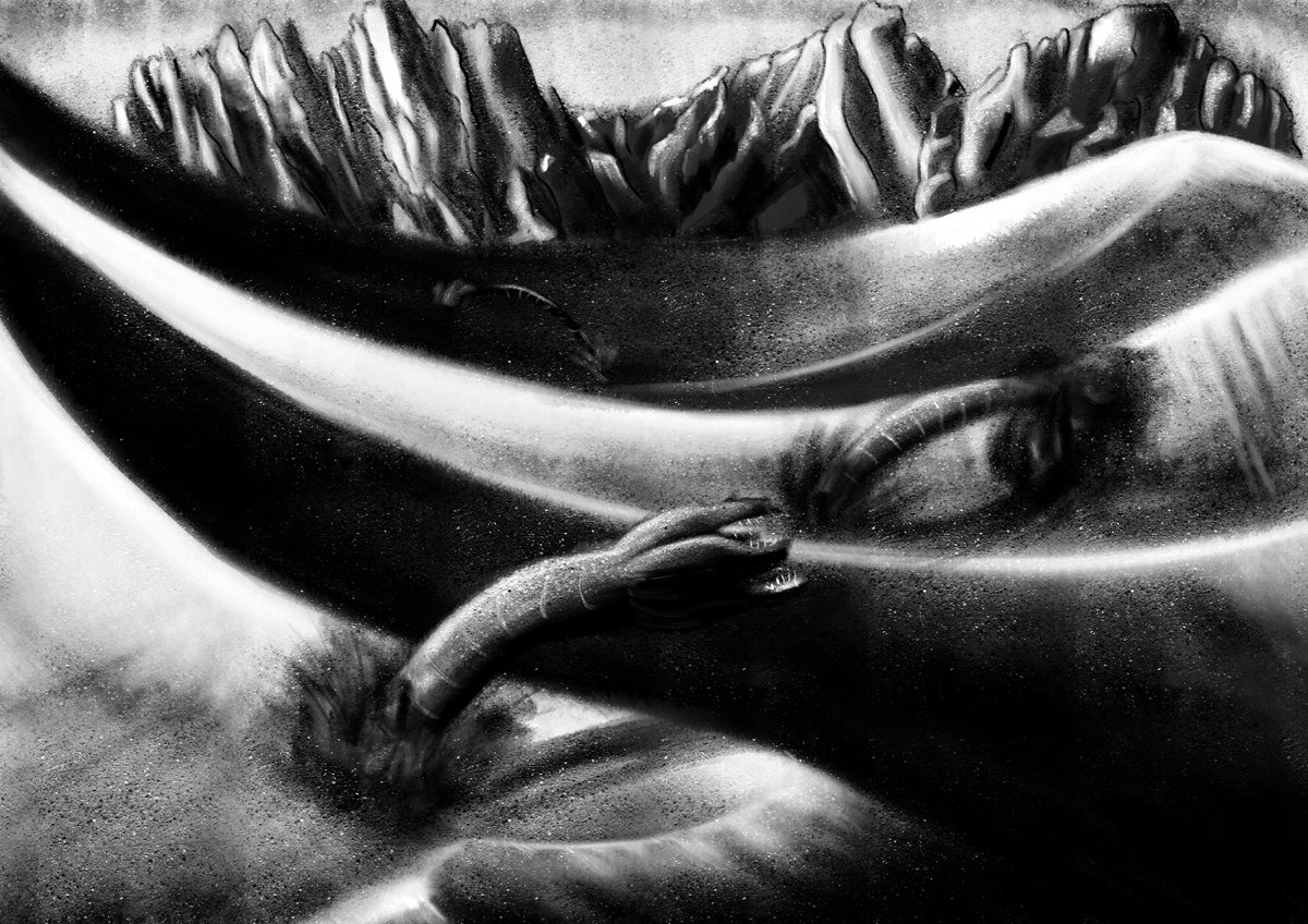 [Inktober day 13 - Dune] I tried a bit of landscaping for this one. I should have made the background lighter but it looks ok. #inktober2020 #day13 #dune #sandworms #landscape #digitalart #creatures #horror