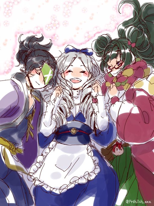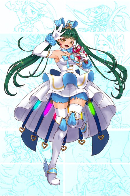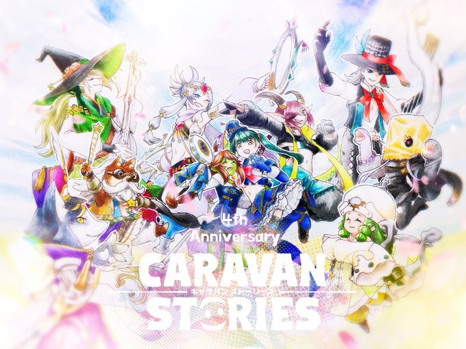 4周年おめでとうございます。 イアル最高峰のパフォーマー達で、この世界に祝福を。 また5周年も祝えますようにと願いを込めて、全員☆5衣装にしました。 #キャラスト4周年記念ファンアート #CaravanStoriesFanArt #キャラバンストーリーズ