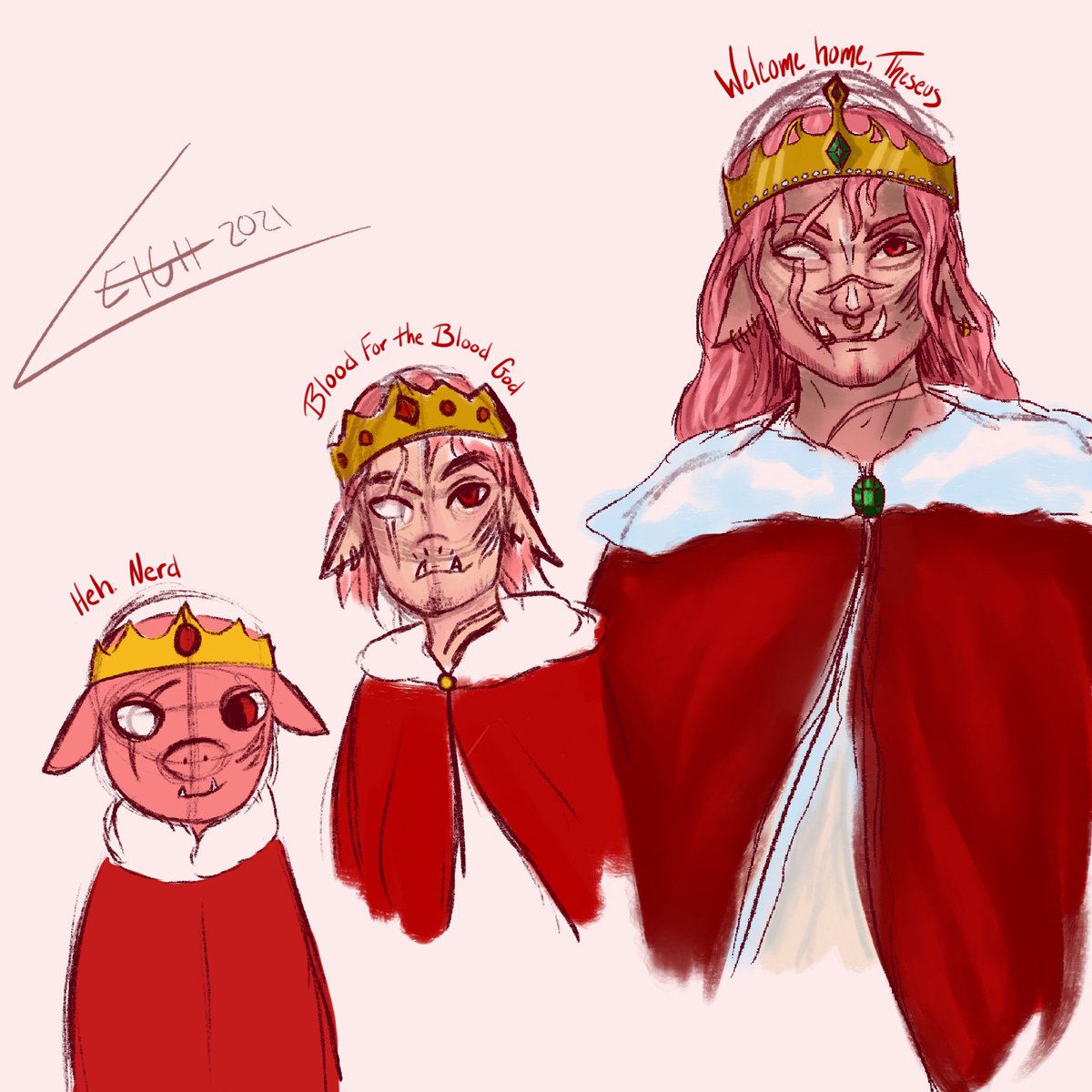 Technoblade has three looks, and that’s it. We’ve got: Pig in a crown That anarchist pig looking man has a crown And the fuckin blood god (with a crown, because style) #technofanart #technobladefanart #technotwt