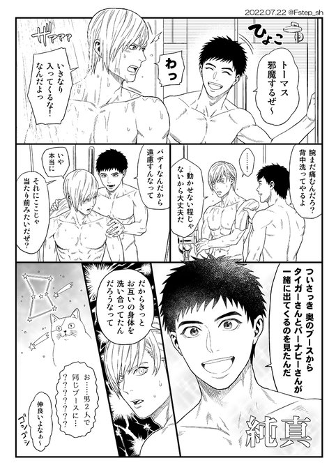 116 443 兎虎 ※背後大変注意(🍌は出ていません) いつもとてもお世話になっている晶さんへのお礼漫画として描きました。 『一話の🐯さんが🐰の栄養ドリンクを飲んじゃったのは喉が乾くようなことをしたからでは!?』という健全で素朴な疑問を元に妄想したものです。 22/07/17 20:37